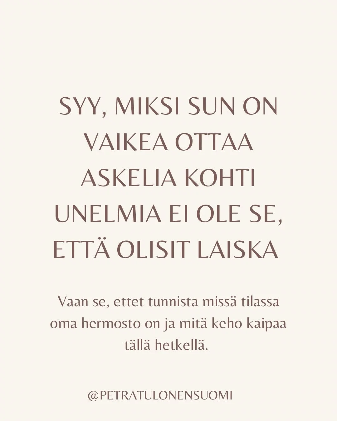 • Oma lähestymistapani on siis yhdistelmä hermoston säätelykeinoja, kehollista läsnäoloa ja valmennusta. Jotta voisit tasapainottaa kehon toimintoja, on hyvä tiedostaa miten keho vastaa erilaisiin päivittäisiin haasteisiin.
