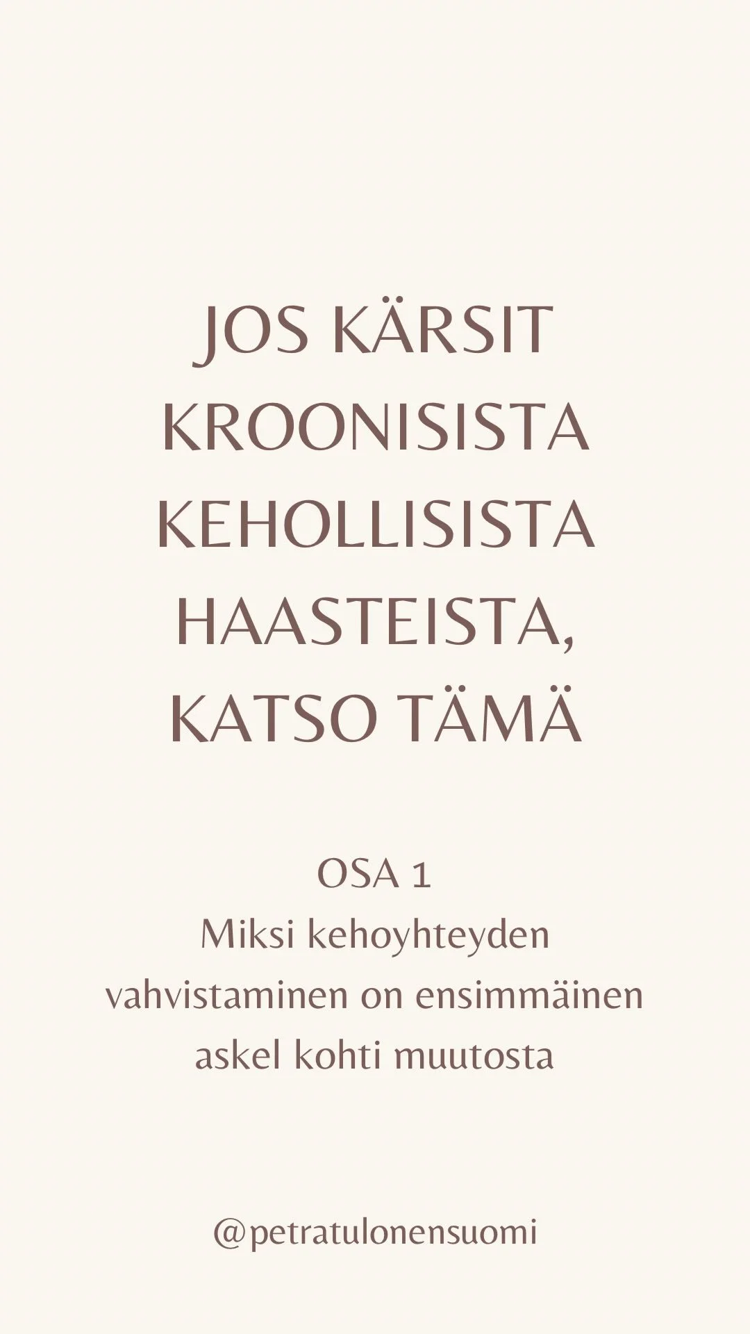 Mun missio on inspiroida ja herätellä sinua oman kehollisen viisautesi äärelle. Sen viisauden äärelle, jonka olet ehkä unohtanut. Kehosi sisältää niin paljon viisautta ja tietoa. Kehosi kantaa muistosi ja kokemuksesi. Se varastoi ajatuksesi, uskomuksesi ja tunteesi. Se pitää kiinni täyttymättömista tarpeistasi. Kehosi kommunikoi kanssasi jatkuvasti - kysymys kuuluukin: Osaatko kuunnella kehoasi?